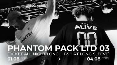 PHANTOM PACK LTD 03 [TICKET ALL NIGHT LONG + T-SHIRT LONG SLEEVE] 01.08 – 12h00 > 04.08 – 12h00 Phantom propose une offre exclusive à 39€. ---------------------------------------------- Détails du pack 1 Ticket All Night Long Valable pour l’événement de votre choix lors de la mise en vente le 04.08 à partir de 12h. 05/09 – JAMES HYPE 10/10 – Reveal 04.08 17/10 + 18/10 – CHARLOTTE DE WITTE² 31/10 – VLADIMIR CAUCHEMAR presents CHROME 01/11 – VERKNIPT 21/11 – MIND AGAINST present HABITAT 29/11 – RIVO 06/12 – REZZ 12/12 – TRYM 16/01 – RECKLESS 13/02 – MEDUZA³ 14/02 – KI/KI 02/05 – WORAKLS Orchestra aftershow 1 tee-shirt long sleeve (manches longues) Noir ou blanc – 100% coton 240 g/m² – coupe semi-oversize. Impression locale : chaque pièce est imprimée avec soin dans l’atelier parisien Make&Mark. ---------------------------------------------- Conditions Offre limitée. Aucun échange ni remboursement. Le tee-shirt sera à récupérer à l’entrée de Phantom (pop-up) lors d’un événement. Le choix de votre événement se fera lors de l’ouverture de la billetterie, le 04.08 à 12h. Une catégorie spéciale de tickets sera réservée aux détenteurs du pack.