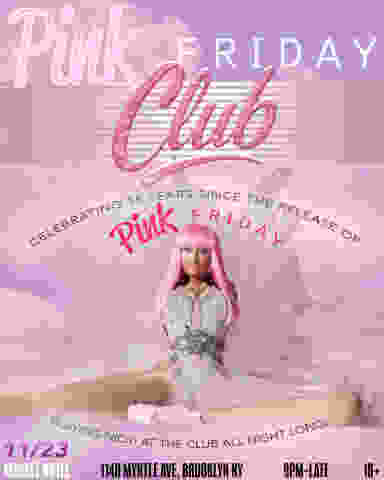 This one is for the boys with the boomin system … PINK FRIDAY CLUB Celebrating 15 years for the release of Pink FRIDAY! This one is for the barbs - We’re celebrating 15 years since Nicki Minaj’s iconic debut album was released! Come channel your inner Roman and have your moment (4 Life) on the dance floor <3 Playing Pink Friday and all of Nicki’s discography all night long! The hits, fan favs and underrated gems DRESS CODE: PINK EXXAGERATED REALNESS Sunday November 23rd Market Hotel 1140 Myrtle Ave, Brooklyn NY 9PM-LATE 18+