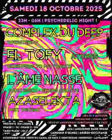 PSYCHEDELIC NIGHT 📅 Samedi 18 octobre 2025 • 23h → 06h 📍 AZA (ancienne gare), Laroque d’Olmes – Ariège, Occitanie Un rendez-vous festif et convivial en pleine nature ! L’ancienne gare de Laroque se transforme en dancefloor coloré pour une nuit de partage autour de la musique électronique, de bons produits locaux et d’une ambiance chaleureuse. 🎶 Line-up COMPLEX DU DEEP Complex du Deep est un DJ au spectre musical large. Bass music, beats balkans, du downtempo au crossbreed, en passant par toutes les mutations de la techno. Digger aventureux, il façonne ses sélections avec curiosité, guidé par un groove profond, destiné à réveiller l’instinct rythmique du dancefloor EL TOFY — Dark Prog ➤ Psytrance [Atomes] "ELTOFY EST UN MUSICIEN TOUCHE À TOUT QUI, APRÈS S'ÊTRE EXPRIMÉ AU DIDGERIDOO ET AU SAMPLER DANS UN GROUPE (AUX INFLUENCES SKA, PUNK , ELECTRO), A DÉCOUVERT LES DANCEFLOORS ET LA MUSIQUE ÉLECTRONIQUE IL Y PLUS DE 20 ANS. TRANSPORTÉ PAR L'AMBIANCE DES DANCEFLOORS, PAR LA DANCE ET LA TRANCE IL A ALORS COMMENCÉ À MIXER (PASSANT DES VINYLS AU NUMÉRIQUE) ET DÉCIDÉ DE S'INVESTIR DANS CE MILIEU, EN TANT QU'ORGANISATEUR D'ÉVENEMENTS AU SEIN DE L'ASSOCIATION PSYTRANCE ATOMES MAIS AUSSI COMME DÉCORATEUR ET DJ. COTÉ DJ: LES SETS D’ELTOFY NAVIGUENT, SUIVANT L'HUMEUR ET LE MOMENT DANS LA SOIRÉE, DE LA PSY-PROG, DARK-PROG, À DE LA PSYCHÉ, OU GOA EN PASSANT PAR LA FOREST (POUR CEUX QUI CONNAISSENT LE JARGON DE LA PSYTRANCE). IL SONT DANS TOUT LES CAS PSYCHÉDÉLIQUES, HYPNOTIQUES ET ÉNERGIQUES ET SONT UNE INVITATION AU VOYAGE INTÉRIEUR, À L’ÉVASION, À LA DANCE, AU PARTAGE …… À LA TRANCE." https://soundcloud.com/eltofy L’ÂME NASSE — Dark Disco • Ethno Groove Ex membre de la regrettée Quetzal'Coallition, L'Âme Nasse est un DJ sans amarres ni scrupules. Infatigable chercheur de pépites, ce flibustier de la fiesta est toujours à la recherche du bon sillon au bon moment, celui qui mettra le dancefloor en ébulition. Ses sélectas surprenantes et colorés sont placées sous le signe du groove, de ceux profonds qui prennent aux tripes. Toujours fidèle à ses goûts et ses intuitions afin de ne pas suivre les courants du moment et offrir des sets innovants et rafraîchissants. L'Âme Nasse c'est une proposition de voyages sans escales ni frontiéres AZASELEKTA — Psy Techno Derrière AZA Selekta, on retrouve le producteur Audioflow — résident de la planète AZA et explorateur sonore tous azimuts. Touche-à-tout passionné, il déniche, assemble et partage ses pépites musicales avec une signature bien à lui. Que ce soit en DJ set, en live ou en vinyle, il navigue entre styles et tempos, toujours avec justesse et groove. 🌱 Sur place Lieu in & outdoor Déco immersive par Anonymous Substances & Da’Jazz Showlight & Visual Art by Planète AZA Boissons et Produits locaux pour se régaler entre deux danses 🎟 Tarifs Prévente en ligne : Phase 1 → 5 € | Phase 2 → 10 € Sur place : 15 € Accès facile par la Voie Verte du Canal du Midi (Montségur – Mirepoix – Lavelanet) Et par l’Avenue Pierre Semard • AZA ANCIENNE GARE 09600 Laroque d’Olmes Une belle soirée pour danser, se retrouver et profiter ensemble sous les étoiles ✨ Alors ne tardes pas et Réserve ton week-end dès Maintenant 🎵🖤🎶