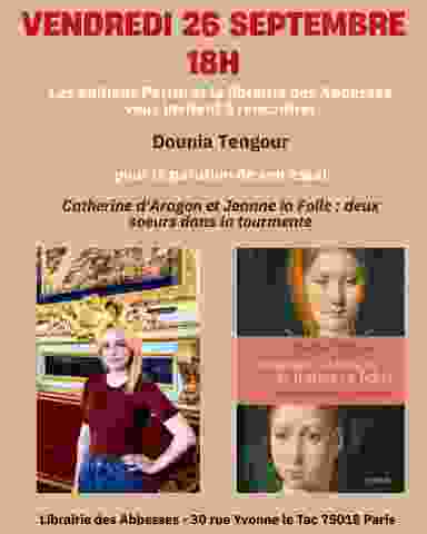 Les éditions Perrin et la librairie des Abbesses sont heureux de vous inviter à rencontrer Dounia Tengour pour la parution de son essai Catherine d'Aragon et Jeanne la Folle : deux sœurs dans la tourmente.