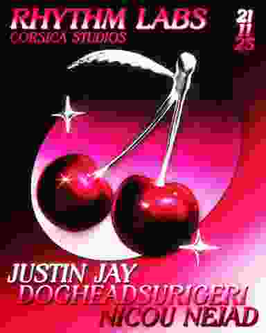 6 YEARS OF RHYTHM LABS Our 6th birthday lands heavy — and bittersweet. After a series of unforgettable, sold-out dances, we return to Corsica Studios one last time before their doors close. To mark the end of this era, we're flying in a longtime fave: Justin Jay with a career spanning more than a decade and recent releases on marquee labels including Club Heart Broken, Hot Meal, Warner/Major Recordings, Trick, Shall Not Fade, Dirtybird, Desert Hearts, and more. Joining him is dog head surigeri, a regular who's been central to our Corsica story, and Rhythm Labs co-founder nicou nejad