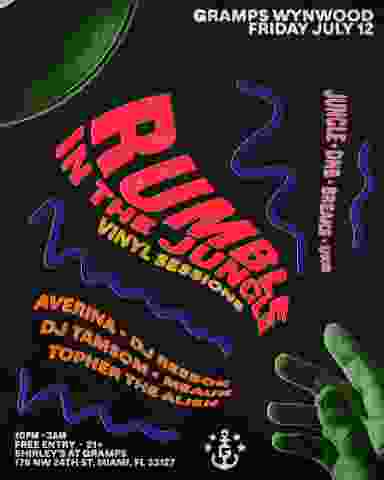 RUMBLE IN THE JUNGLE'S FIRST EVER VINYL SESSIONS! FEATURING SETS FROM: AVERINA DJ REEBOK MEAUX DJ TAMSOM TOPHER THE ALIEN 21+ // FREE ENTRY W/ RSVP