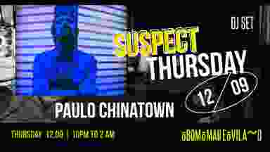 Prepare-se para transformar as suas quintas-feiras em noites memoráveis com o "Suspect Thursday" no bar do Vilão! A partir das 22h, o nosso espaço enche-se com os sons vibrantes e ecléticos dos melhores DJs da cena eletrónica. Todas as semanas, uma nova vertente e uma nova energia para a pista. Não perca a oportunidade de viver uma noite diferente e excitante no coração de Lisboa. Deixe que o "Suspect Thursday" transforme a sua quinta-feira numa experiência inesquecível. Esta semana apresentamos: PAULO CHINATOWN Paulo é um cineasta e DJ apaixonado pela vanguarda e o underground, com uma carreira marcada por performances em várias cidades como Londres, Lisboa e Berlim, onde vive há mais de 10 anos. Com uma vasta coleção de discos, ele organizou festas icónicas e agora se dedica ao seu projeto Music With A Meaning, produzindo música e mantendo suas raízes underground. Siga-nos nas redes sociais para ficar a par da programação e das surpresas que estamos a preparar para si. Vemo-nos na pista de dança!