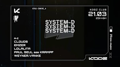 System-D back dans les bacs, la cavale est terminée. A ceux qui étaient déjà là avant Covid, c'est l'heure de se remémorer nos meilleurs souvenirs. A tous les nouveaux, bienvenue dans nos futurs souvenirs. ◾️LINE-UP◾️ A-Z . Clouds . Emzer . Lolalita . Paul Seul b2b Krampf . Weyner.Vanke ◾️RÈGLES◾️ Ce lieu se veut sûr. Les attitudes violentes, discriminantes ou oppressives n’y ont pas leur place. Celles et ceux qui les perpétuent seront invité·es à quitter immédiatement l’espace. Si quelque chose dérange, même à bas bruit, il est important d’en parler. À quelqu’un de confiance, au moment possible. Une équipe safer est à disposition pour tout signalement. ENG// This space aims to be safe. Violent, oppressive or discriminatory attitudes have no place here. Anyone responsible will be asked to leave immediately. If something feels wrong even quietly it matters to speak up. To someone you trust, when the time feels right. A safer team is available for any report. ◾️ACCÈS◾️ Lieu : KODZ Centre Commercial – 59320 Englos Entrée interdite aux mineur·es. Carte d’identité originale obligatoire (aucune copie acceptée). La direction se réserve le droit d’admission. ◾️VESTIAIRE◾️ Obligatoire. 2€ par article / 4€ par sac. Capacité limitée. Aucune valise autorisée. Sortie définitive. ◾️IMAGE◾️ Photos et vidéos seront prises pendant l’événement. Elles peuvent être utilisées par le KODZ pour ses communications. Si vous ne souhaitez pas apparaître, signalez-le dès votre arrivée. ◾️SUIVEZ-NOUS◾️ instagram.com/kodzclub facebook.com/kodzclub tiktok.com/@kodzclub