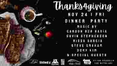 You are invited to another annual Thanks-4-Giving Dinner Party + Late night event. 8pm-Late Music By: Carson b2b Nadia