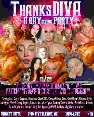Market Hotel Presents: THANKSDIVA: a GAYGIVING PARTY ! A PARTY ON THANKSGIVING WEEKEND DEDICATED TO THE DIVAS BEHIND THE GAYEST MUSIC KNOWN TO HUMANITY A club night serving you the purest form of gay pop! We invite you to a party that encapsulates the true essence of the gay icon, playing the music of the divas that’s been there for the gays since day 1. Dedicated to the DIVAS we grew up admiring, and the ones killing it today! The perfect carry for Thanksgiving weekend, this is not a night to miss <3 Playing Lady Gaga, Beyonce, Madonna, Charli XCX, Chappell Roan, Cher, Nicki Minaj, Rihanna, Kylie Minogue,  Mariah Carey, Rupaul, Kim Petras, Miley Cyrus, Britney Spears, Kesha, Diana Ross, Arianna Grande,  Whitney Huston, Carly Rae Jepsen, SOPHIE, Christina Aguilera, Addison Rae, Lorde, and many more! Saturday 11/29 11pm-Late Market Hotel 1140 Myrtle Ave. Brooklyn 18+