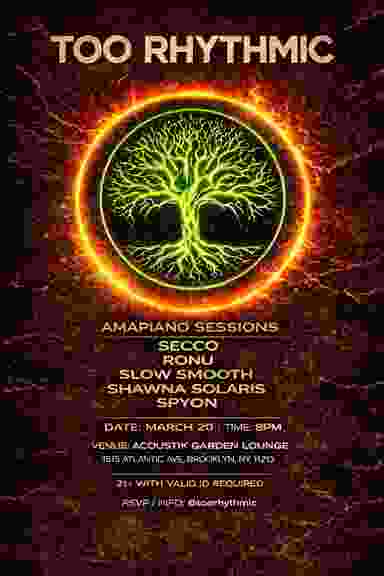 “Too Rhythmic presents: Amapiano Sessions, an immersive night dedicated to the pulse of contemporary South African dance music. On March 20, Acoustik Garden Lounge sets the stage for groove, movement, and community as Secco, Ronu, Slow Smooth, Shawna Solaris, and Spyon take you through deep basslines, rolling log drums, and soulful piano melodies. Doors open at 8 PM. Come early, stay late, and move with intention.