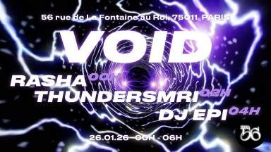 🌑 LUNDI 26 JANVIER 2026 – VOID 🌑 VOID revient pour hanter le creux de la semaine. Pas de répit, pas d’échappatoire juste une descente brute dans la matière sonore. La transe s’infiltre, lente puis implacable, jusqu’à faire parler les murs du Studio56. Quatre faiseurs d’ombres pour modeler le vide. Prépare ton corps : ici, on ne danse pas on disparaît. ▬▬▬▬▬▬ TIME TABLE ▬▬▬▬▬▬ 🌀 00H - RASHA IG : https://www.instagram.com/_rasha_b SC : https://soundcloud.com/rtct_ph0 🔊 02H – THUNDERSMRI IG : https://www.instagram.com/thundersmri SC : https://soundcloud.com/thundersamurai 💥 04H – DJ ÉPI IG : https://www.instagram.com/djepicurien SC : https://soundcloud.com/l-o-ddn #InsomniaParis #Studio56 #RASHA # THUNDERSMURAI # DJEPI#HardTechno #MentalTechno #DarkTechno #HypnoticTechno #TechnoParis #ParisRave #UndergroundRave #FridayRave #WeekendRave #NoSleepOnlyTechno #HardGrooves #SleeplessGrooves #WarehouseMood #FromMidnightToMorning #BassAndRituals #UndergroundTechno #ParisByNight #RaveCulture #TechnoAddict ▬▬▬▬▬▬ INFOS PRATIQUES ▬▬▬▬▬▬ 📅 Date : lundi 26 janvier 2026 ⏰ Horaires : 00H / 6H 🎶 Styles : Techno / Mental / Groove / Raw / Acidcore 📍 Lieu : Studio 56 56 Rue de la Fontaine au Roi, 75011 Paris Ⓜ️ M°3 – Parmentier Ⓜ️ M°5/8/9/11 – République Ⓜ️ M°11 – Goncourt ▬▬▬▬▬▬ 𝖳𝖠𝖱𝖨𝖥𝖲 & 𝖳𝖨𝖢𝖪𝖤𝖳𝖲 ▬▬▬▬▬▬ 🎟️ Early Members Tickets : 7,99€ 🎟️ Regular Members Tickets : 8,99€ 🎟️ Late Tickets : 10,99€ ✅ Tickets sur place : 13€ 🎒 Vestiaire obligatoire : 2,00€ ▬▬▬▬▬▬ RÈGLES DE VIE ▬▬▬▬▬▬ ⛔️ Tolérance zéro pour comportements racistes, sexistes, homophobes, transphobes 🔞 Interdit aux moins de 18 ans 💪 Aucune violence tolérée 📍 Respect du lieu et des autres 🏳️‍🌈 LGBTQIA+ friendly 💧 Bois de l’eau, prends soin de toi et de tes ami·e·s 💊 Sois attentif à ce que tu consommes 🚗 Ne conduis pas si tu n’es pas en état ⚠️ IMPORTANT ⚠️ L’entrée sera refusée à toute personne en état d’ivresse ou sous influence de drogues. Notre priorité : un espace safe pour tou·te·s. Aucune forme de haine ne sera tolérée. Rave libre, rave consciente.