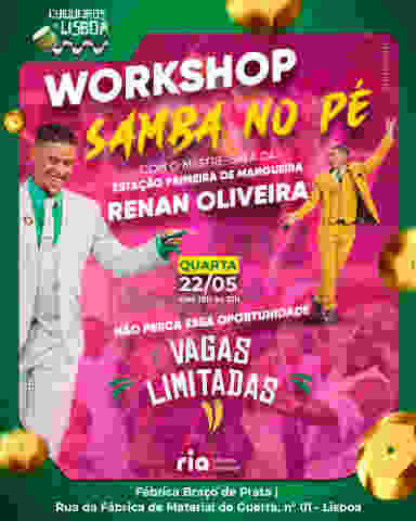 WORKSHOP SAMBA NO PÉ - com RENAN OLIVEIRA, em LISBOA!!! MESTRE SALA DA ESTAÇÃO PRIMEIRA DE MANGUEIRA, RENAN é brasileiro e carrega o samba na alma. Mestre sala, dançarino e professor com trajetória sólida em grandes escolas de samba como : Mangueira, Império da Tijuca , também atua na União do Parque do Acari. Ele já representou o Brasil na Olimpíadas, na Copa do Mundo e no Paris Fashion Week. Agora em Lisboa ele chega para compartilhar sua experiência, técnica e paixão com todos que queiram sentir o verdadeiro ritmo do samba no corpo. Palestra e técnica , tire suas dúvidas . PASSISTAS E MALANDRO. As vagas são limitadas - Garanta já a tua!!!