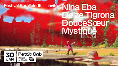 FESTIVAL PARALLÈLE et BI:POLE présentent : FESTIVAL PARALLÈLE x PETIT CAB, PETIT CAB, VENDREDI 30 JANVIER 2026, 22h30 > 04h00 Le Festival Parallèle investit le Petit Cab pour célébrer l'émergence avec deux lives et deux DJ sets pour nous réchauffer en plein hiver ! Nina Eba ouvrira la soirée avec son live hybride, entre club music et R&B alternatif ; Deize Tigrona, pionnière du funk brésilien et l'une des premières femmes MC à chanter dans les baile des favelas de Rio de Janeiro au début des années 2000 enchaînera ; DouceSœur, quant à iel, nous plongera dans son univers mixant culture manga 2000 et identité queer ; et pour clôturer la soirée, un set de Mystique, entre mélodies populaires, hybridités électro et rap alternatif. - ANNULATION - En raison de circonstances indépendantes de la volonté de l’artiste et des organisateur·ices, Etaf ne pourra pas assurer son live lors de la soirée du 31 janvier au Petit Cab, dans le cadre de Parallèle 16. Nous aurons le plaisir d’accueillir Deize Tigrona, qui se produira en remplacement, aux côtés de Nina Eba, DouceSœur et Mystique.     Les billets déjà achetés restent valables. Les personnes souhaitant un remboursement peuvent se rapprocher de la billetterie (billetterie@bi-pole.org). 𝗜𝗡𝗙𝗢𝗦 𝗣𝗥𝗔𝗧𝗜𝗤𝗨𝗘𝗦 📅 VENDREDI 30 JANVIER 2026 23H00 > 04H00 📍 PETIT CAB Friche la Belle de Mai 41 rue Jobin 13003 MARSEILLE La prévente, le billet acheté sur place ou l'invitation ne sont pas un droit d'entrée. La direction de l'établissement recevant du public se réserve le droit d'admission. En cas de refus d'admission, veillez à réclamer votre remboursement de prévente le soir même auprès du responsable de l'établissement à la porte. Le tarif inclusif est accordé aux personnes bénéficiaires du RSA, de l’AAH, de l’ASPA, de l’ASS, de l’ADA, de l’ASI, et de l’Allocation veuvage. Pour obtenir le lien vers le billet, merci de prendre contact avec nous : billetterie@bi-pole.org