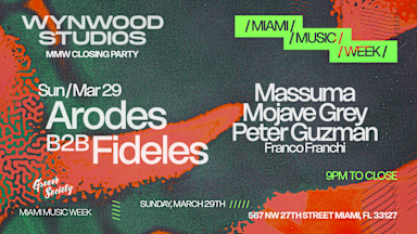 Close out MMW with Arodes, Fideles, Massuma, Mojave Grey, Peter Guzman, Franco Franchi @ Wynwood Studios.